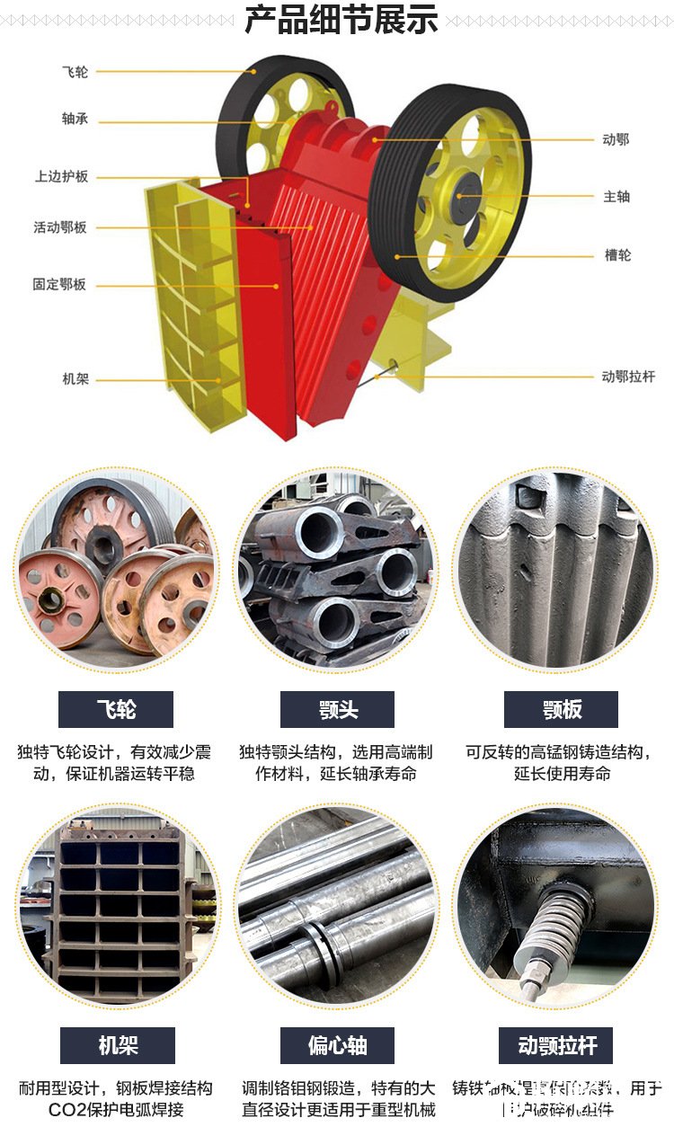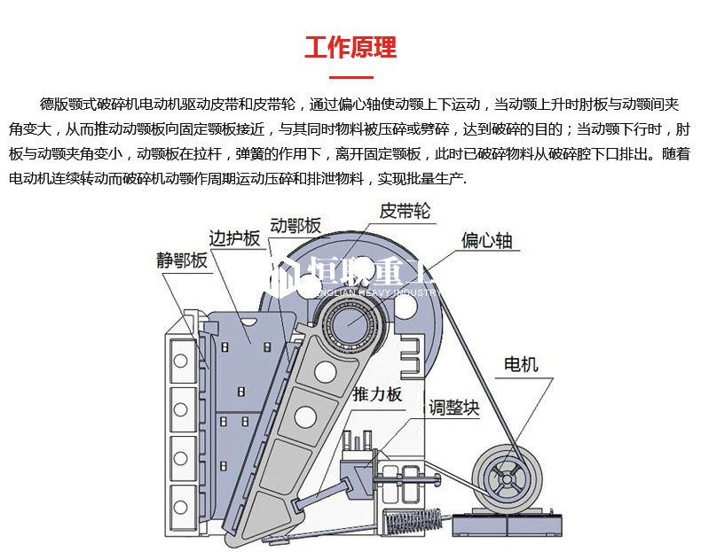 主要有動(dòng)顎板、精顎板、邊護(hù)板、皮帶輪、偏心軸、電機(jī)、推力板、調(diào)整塊、肘板等組成。