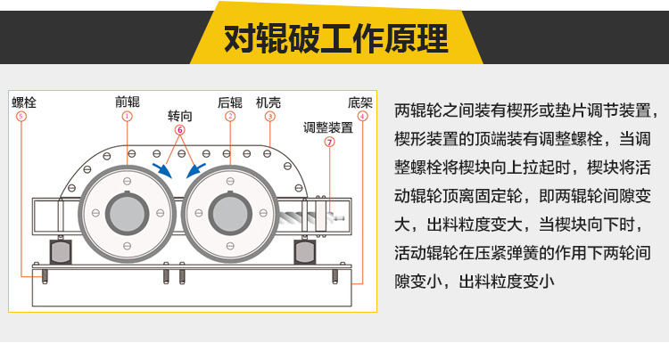 配置了防塵及消音裝置, 有效實(shí)現(xiàn)了低粉塵、低噪音的理想生產(chǎn)狀態(tài)。輥式破碎機(jī)是利用輥面的摩擦力將物料咬入破碎區(qū),使之承受擠壓或劈裂而破碎的機(jī)械。當(dāng)用于粗碎或需要增大破碎比時(shí),常在輥面上做出牙齒或溝槽以增大劈裂作用。