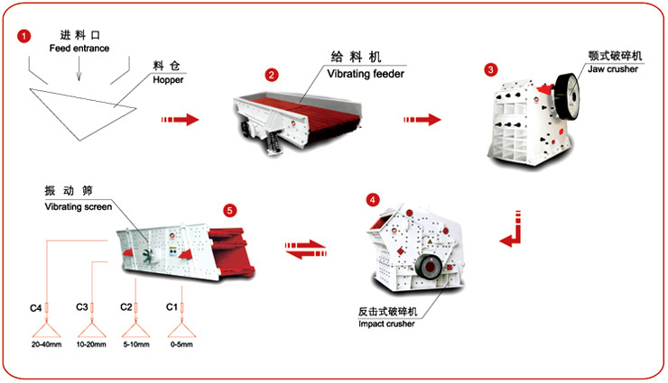 石子破碎生產(chǎn)線中,破碎物料硬度不超過320Mpa,如花崗巖、玄武石等,皆適用二級破碎工藝,其主要設備有:振動給料機顎式破碎機(一破)石料破碎機(二破,可為反擊式破碎機、錘式破碎機、沖擊式破碎機)振動篩成品石子,中間以皮帶輸送機傳送物料。當物料硬度不超過150Mpa時,為節(jié)約客戶成本,提高工作效率,一般采用一次成型設備,其主要設備有:振動給料機復合破碎機(即二合一破碎機,可把大塊物料通過特有的設計,一次達到理想粒度,一般為錘式破碎機)振動篩成品石子,中間以皮帶輸送機傳送物料。