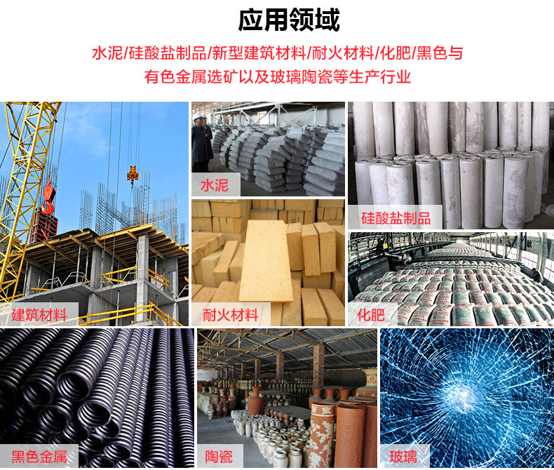 【應(yīng)用范圍】:水泥,硅酸鹽制品,新型建筑材料、耐火材料、化肥、黑色與有色金屬選礦以及玻璃陶瓷等生產(chǎn)行業(yè)。