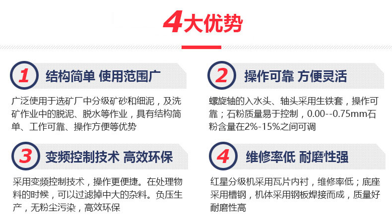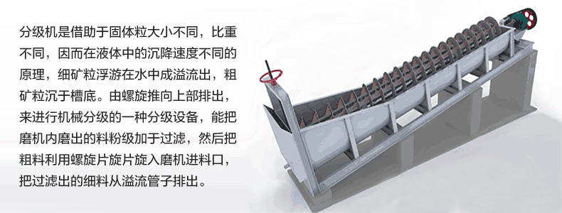 螺旋分級機是選礦的設(shè)備之一,螺旋分級機借助固體顆粒的比重不同,因而在液體中沉淀的速度不同的原理,進行機械分級的一種設(shè)備。