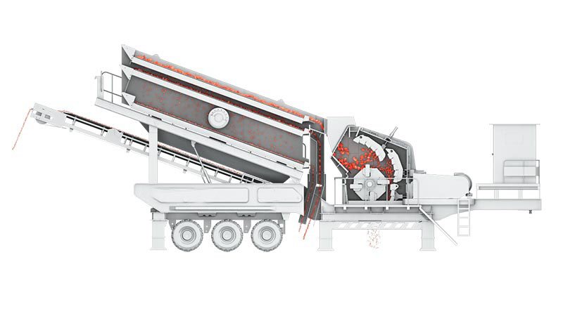 反擊移動破碎站所有部件機載,包括:牢固的機架、反擊式破碎機、給料機、振動篩、傳送帶、電動機和控制箱等。